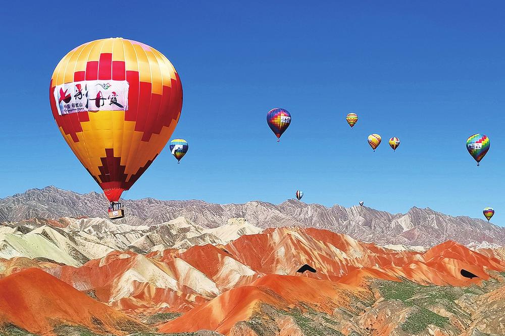 游客在张掖丹霞景区乘坐热气球俯瞰大自然的鬼斧神工。