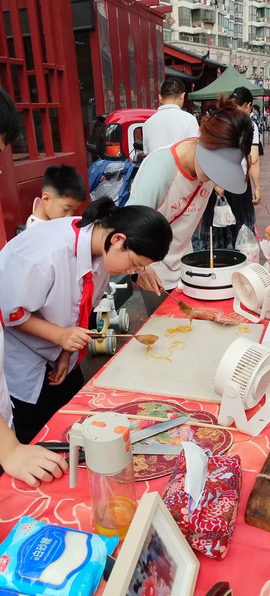 献给祖国的颂歌奏响起来,欢乐的腰鼓敲起来,昂扬的台步走起来……10月1日下午,浦东周浦镇小上海步行街格外热闹。中学生画糖画、糕点老师傅乡土月饼制作、乡村老艺人芦苇编织、乡村老妈妈搓稻草绳等,沿着牌楼口一字排开。国庆中秋双节喜相逢,步行街上拉满浓浓的民俗风。由周浦镇人民政府主办、周浦企业文化促进会承办、泰隆银行周浦支行协办的周浦镇第68届国庆节中秋节“泰隆杯”小上海民俗文化展示会开启了欢乐之旅。